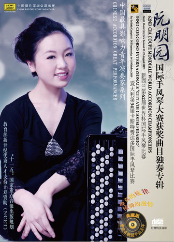 作為教育部“新世紀(jì)優(yōu)秀人才支持計(jì)劃資助”項(xiàng)目,這張 《阮明園國(guó)際手風(fēng)琴大賽獲獎(jiǎng)曲目獨(dú)奏專輯》由北京梅蘭芳大劇院錄音工作室傾情錄制,由北京深藍(lán)隆音文化傳播有限公司榮譽(yù)出品,由中國(guó)唱片深圳公司隆重出版。被列為了中國(guó)最具影響力青年演奏家系列、“十一五”國(guó)家重點(diǎn)音像出版規(guī)劃。本專輯囊括了阮明園榮獲意大利第34屆卡斯特費(fèi)達(dá)多國(guó)際手風(fēng)琴比賽成年組第二名和新西蘭第62屆世界杯國(guó)際手風(fēng)琴比賽世界杯藝術(shù)家組第三名等眾多國(guó)際大獎(jiǎng)的重要作品,并由曹曉青教授專業(yè)點(diǎn)評(píng),具有極高的藝術(shù)鑒賞與收藏價(jià)值。