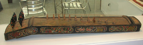 雅托葛用的松特作。 通長 139 cm;厚 7 om,寬 28 cm,梁內(nèi)弦長 96 cm。弦為絲質(zhì)。琴身以紅、黃、藍、綠、白色繪制成具有蒙古族風(fēng)格特點的圖案。弦碼的高度為5 om,形狀古老。雅托葛有它自己獨特的定弦法,雖然也是五聲音階定弦范疇(fa、si兩個音在mi、la上按出),但是碼子是由長短不同的兩行排列而成。雅托葛有四種調(diào),①查干調(diào)——(D調(diào)),2、哈格斯調(diào)——(G調(diào)),③黑勒調(diào)——(c調(diào)),④遞格力木調(diào)——(F調(diào))。這是雅托葛的演奏家們經(jīng)過千百年來的實踐、祖祖輩輩沿襲下來的演奏理論,是蒙古箏所固有的調(diào)名,其轉(zhuǎn)調(diào)規(guī)律則跟漢族箏完全相同。