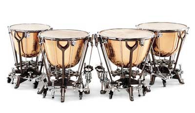 定音鼓屬單皮膜鳴樂(lè)器,造價(jià)昂貴。定音鼓可發(fā)出固定頻率(即音高)的聲音,并能夠在五度音程范圍內(nèi)改變音高。音色柔和、豐滿(mǎn),音量可控制,不同的力度可表現(xiàn)不同的音樂(lè)內(nèi)容,有時(shí)甚至可以直接演奏出旋律。演奏方法分為單奏和滾奏兩種,單奏多用于節(jié)拍性伴奏,滾奏則可以模仿雷聲,且效果逼真。定音鼓作為色彩性打擊樂(lè)器,其豐富的表現(xiàn)力遠(yuǎn)非普通打擊樂(lè)器所能比擬。