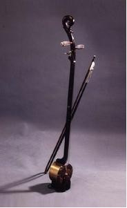 琴桿、琴頭和弦軸用硬木制作。琴桿窄而長(zhǎng),表面作為指板。琴頭呈鏟形、左右各置一弦軸。弦軸表面刻有花紋,軸頂嵌有骨飾。