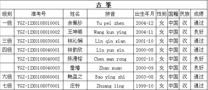 2012年福建藝術(shù)職業(yè)學(xué)院夏季考級福州金欣怡琴行考點(diǎn)古箏考級成績表 |