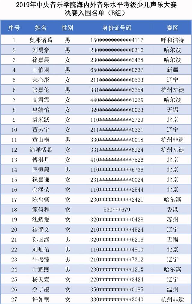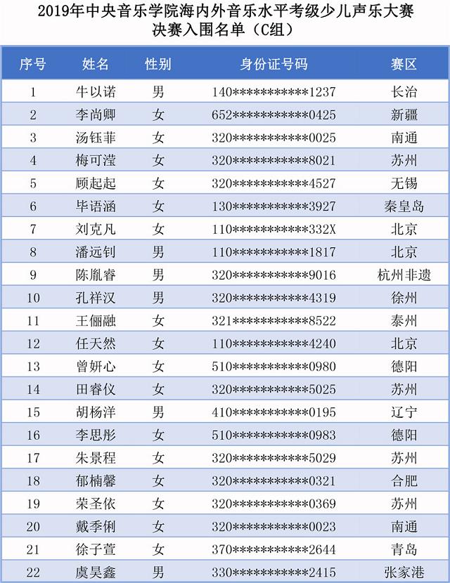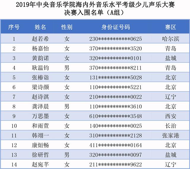 中央音樂(lè)學(xué)院2019年海內(nèi)外音樂(lè)水平考級(jí)少兒聲樂(lè)大賽決賽入圍名單