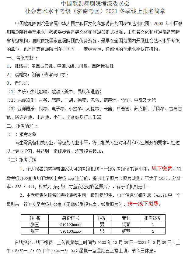 中國(guó)歌劇舞劇院2021年濟(jì)南考區(qū)(冬季)社會(huì)藝術(shù)水平考級(jí)報(bào)名簡(jiǎn)章